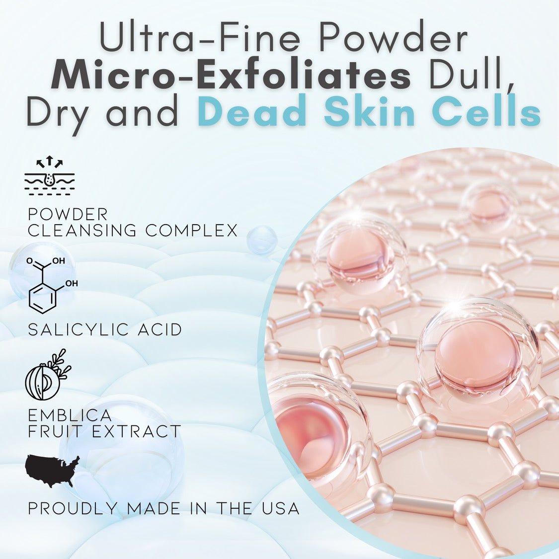 • Ultra-fine powders that micro-exfoliate dull, dry, dead skin cells, instantly leaving skin smoother and brighter