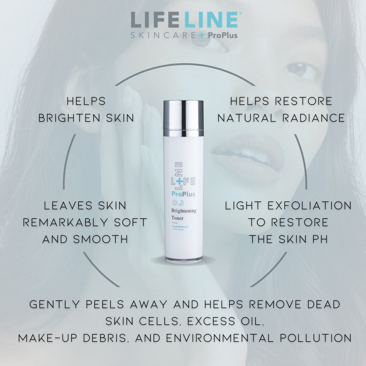 Lifeline ProPlus Brightening Toner, enriched with small molecule technology delicately strips away dead skin cells, excess oil, makeup residue, and pollutants caused by free radicals. This innovative water-based formula is specifically designed to help diminish the appearance of pigmentation and uneven skin tones, while ensuring the skin remains deeply hydrated. Infused with Phytic and Mandelic acids, it enhances cell renewal, while simultaneously smoothing, calming, and lightly exfoliating the skin to revive its natural glow and achieve a luminous effect for a vibrant, healthy complexion.