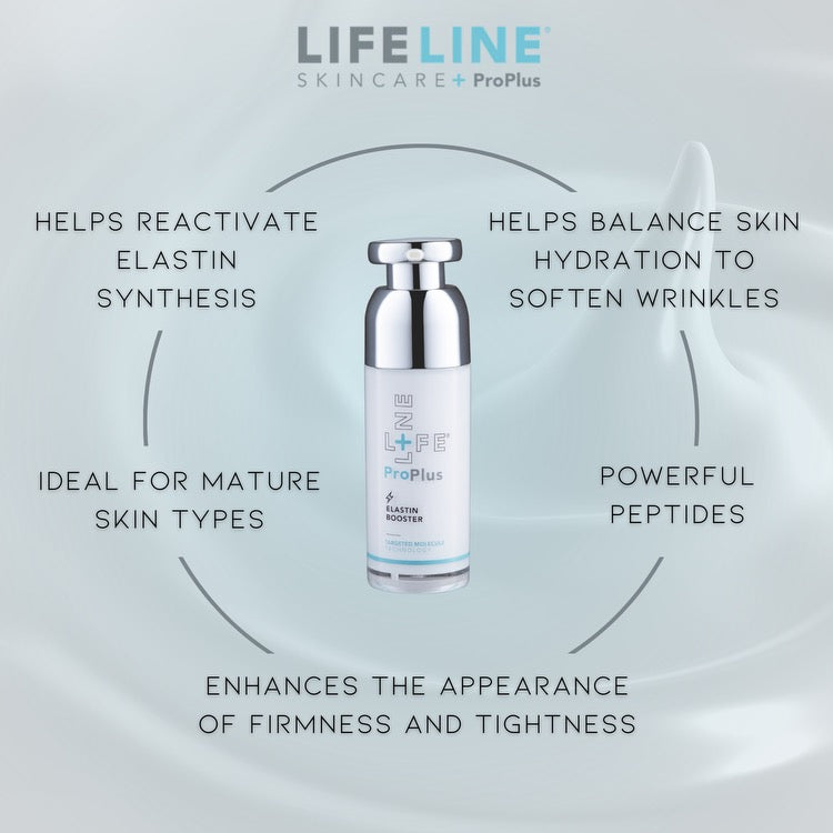 Lifeline Proplus ELastin Booster is utilizing an advanced formulation contain containing Elastin Targeted Molecule Technology (TMT), Lifeline’s proprietary small molecule that boosts elastin production in skin by targeting a specific signaling pathway that increases elastin production in aging dermal fibroblast cells.