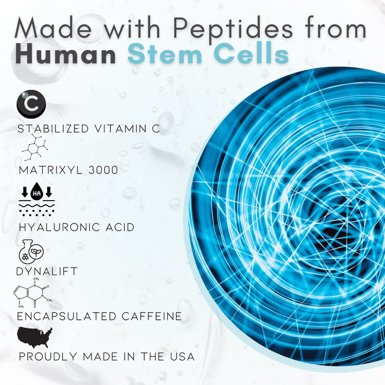 Deionized Water, Glycerin, Ethylhexyl Palmitate, Cetearyl Alcohol, Cocos Nucifera (Coconut) Oil, Caprylic/Capric Triglyceride, Caffeine, Peptides from Non-Embryonic Human Stem Cells, Butyrospermum Parkii (Shea Butter) Fruit, Cetearyl Olivate, Sodium Starch Octenylsuccinate, Myristyl Alcohol, Glycosaminoglycans, Palmitoyl Oligopeptide, Palmitoyl Tetrapeptide-7, Hydrolyzed Jojoba Esters, Chamomilla Recutita (Matricaria) Flower Extract, Sodium Hyaluronate, Olea Europaea (Olive) Fruit Oil, AloeBarbadensis Leaf Extract, Tocopheryl Acetate, Tetrahexyldecyl Ascorbate, Sodium Polystyrene Sulfonate, Sorghum Bicolor Stalk Juice, Anthemis Nobilis Flower Oil, Sorbitan Olivate, Zea Mays (Corn) Starch, Hydrolyzed Corn Starch, Beeswax, Hydrolyzed Corn Starch Octenylsuccinate, Myristyl Glucoside, Polyquarternium-67, Cetearyl Glucoside, Silica, Butylene Glycol, Carbomer, Polysorbate 20, Hydroxyethyl Behenamidopropyl Dimonium Chloride, Polysorbate 60, Acrylates/C10-30 Alkyl Acrylate Crosspolymer, Hexylene Glycol, Ammonium Acryloyldimethyltaurate/VP Copolymer, Phenoxyethanol, Sodium Hydroxide, Caprylyl Glycol, Ethylhexyl Glycerin.